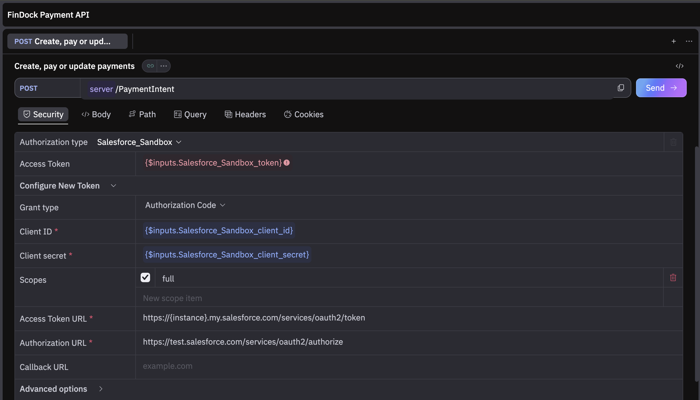 For example, if your domain is https://findock-dev-ed.my.salesforce.com, you would send your payment requests to: https://findock-dev- ed.my.salesforce.com/services/apexrest/cpm/v2/PaymentIntent For a full list of endpoints, please see our API reference specification.