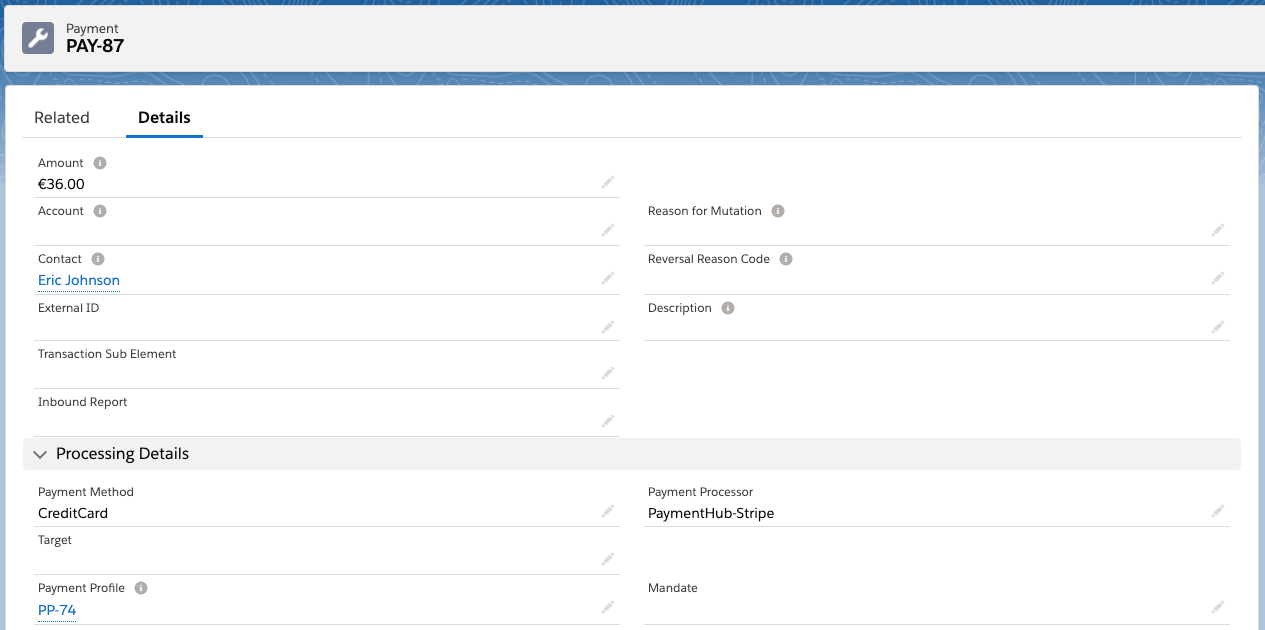 },The PaymentMethod object indicates the transaction uses the credit card payment method. Since this Salesforce org has several processors configured that can be used to perform credit card payments, we explicitly specify Stripe as the processor.