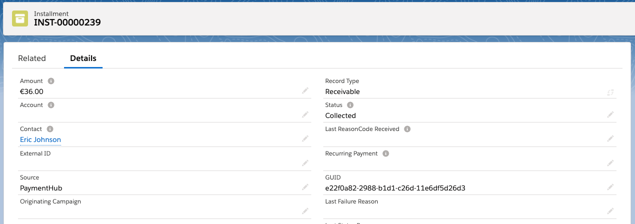 - The installment record is updated (status is set to ‘Collected’ and amount is reduced by the amount paid to 0).
