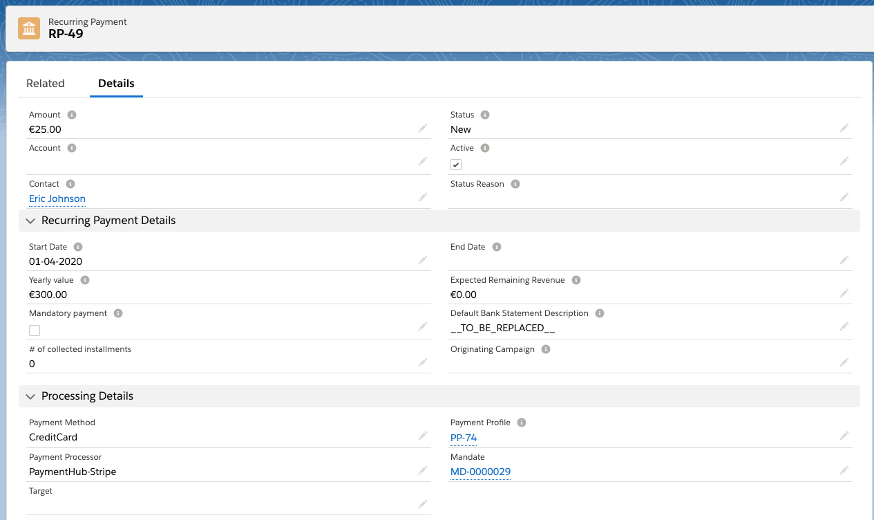 - the Mandate with data (in this case a Stripe Credit Card token) to collect further installments through the Payment Schedule.