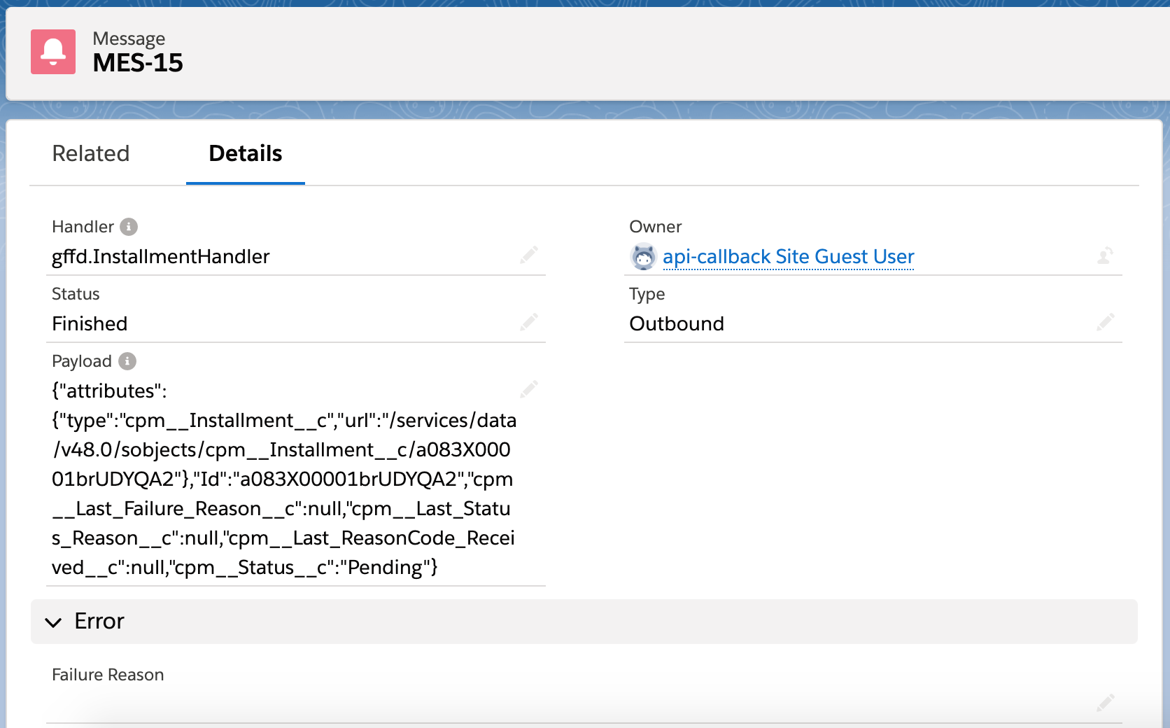 - If you do not find a message corresponding to the webhook call of the payment processor, check the settings related to the Remote Site Settings and Callback URL as described above.