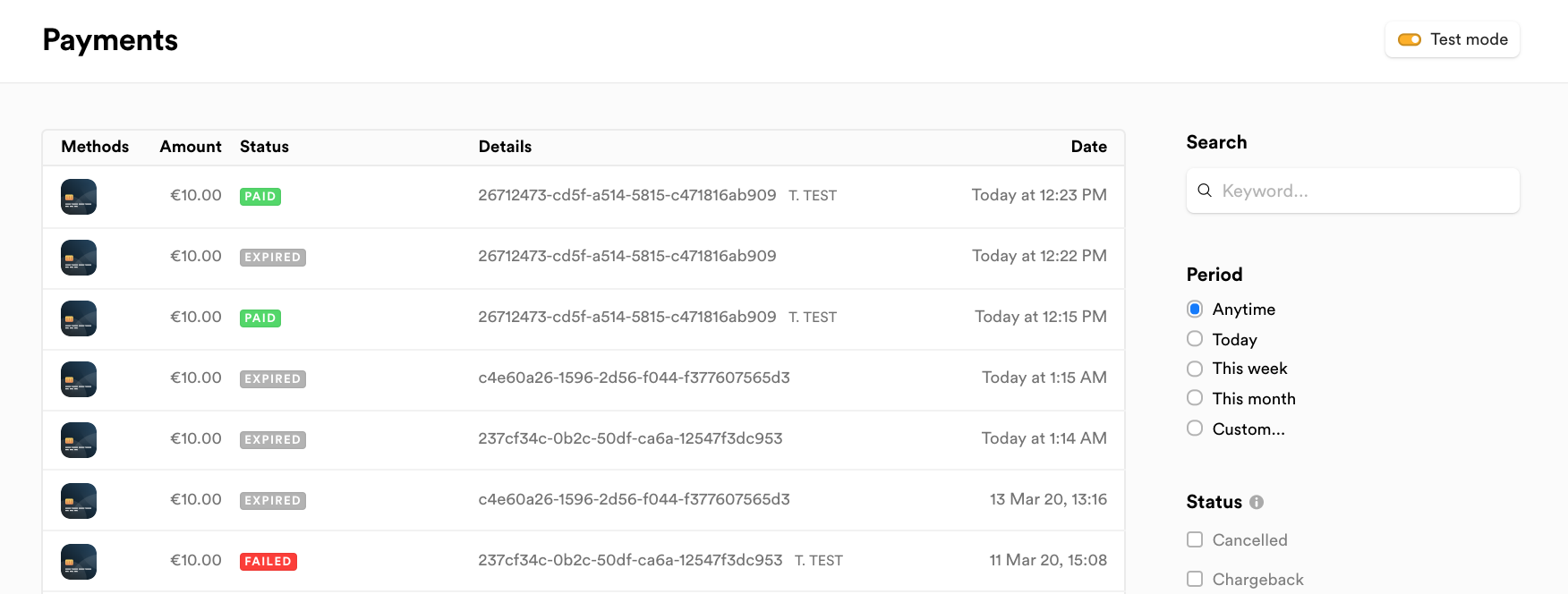 Almost all Payment Service Providers (PSPs) provide a dashboard, like the screenshot below, where you can check actions initiated by the FinDock Payment API. With these dashboard, you can check, for instance: