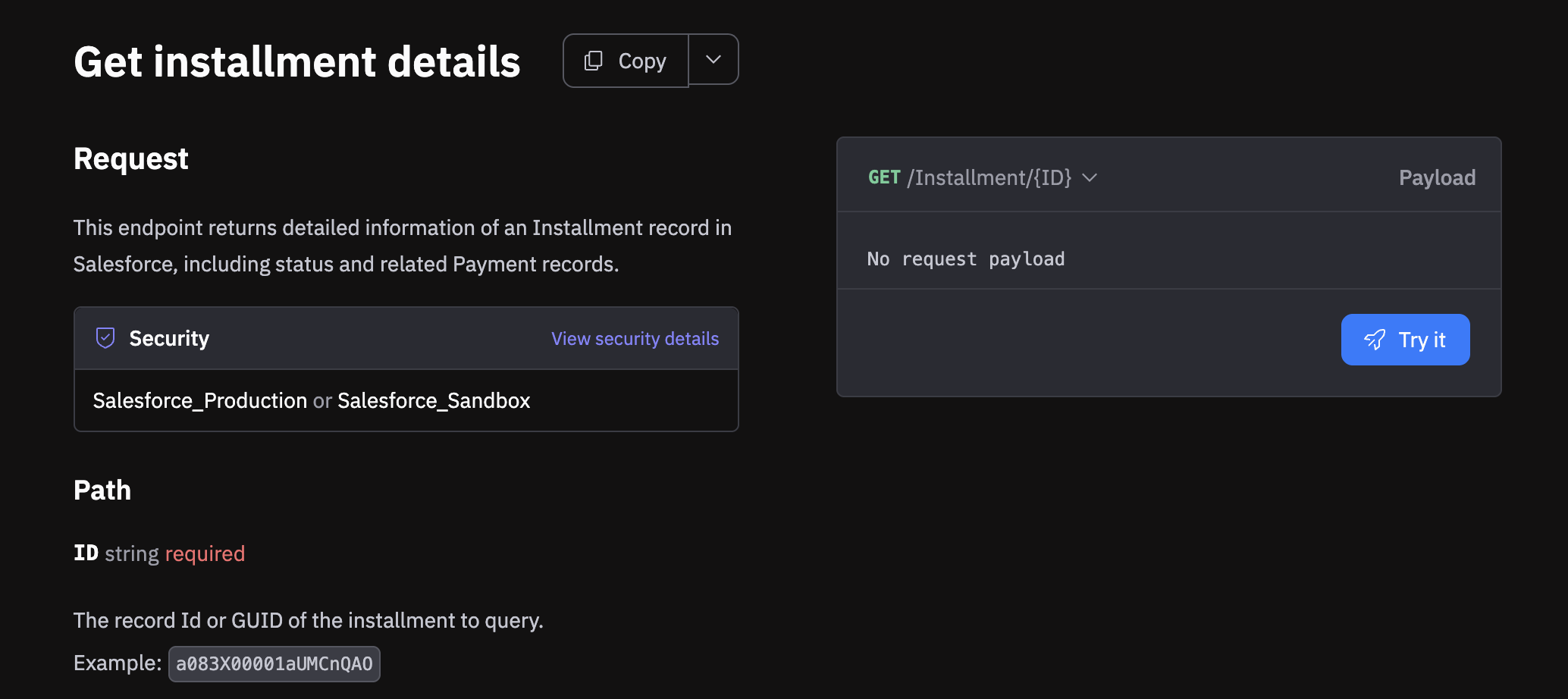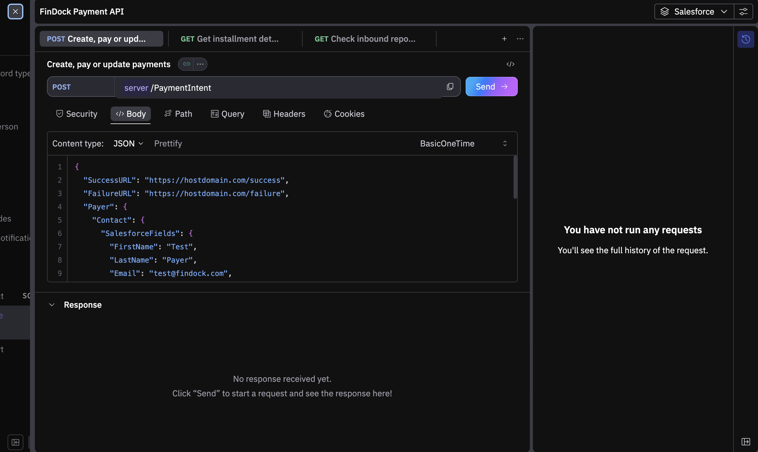 The browser-based API test app enables you to make calls to the Payment API of an integrated Salesforce org directly from the API specification.
