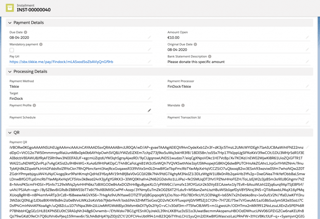 You can generate a Tikkie URL and QR from any object in Salesforce using FinDock Quick Tikkie. This app generates Tikkie URLs and QRs that can be added to any customer or donor communication, such as email or direct message services When a Tikkie is generated with a specific amount, FinDock automatically creates an installment. To use Quick Tikkie: