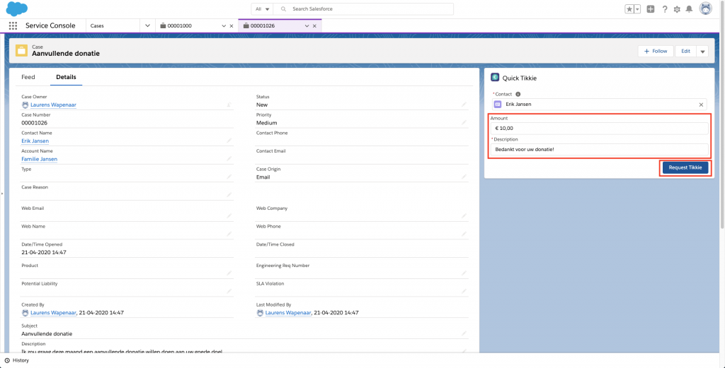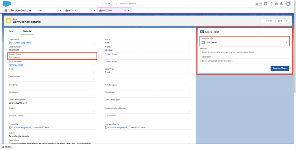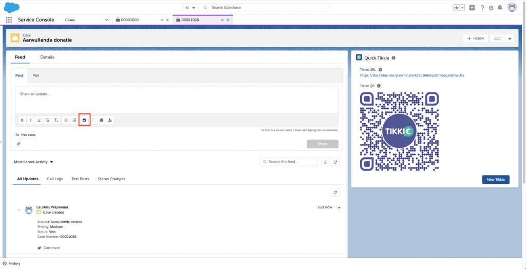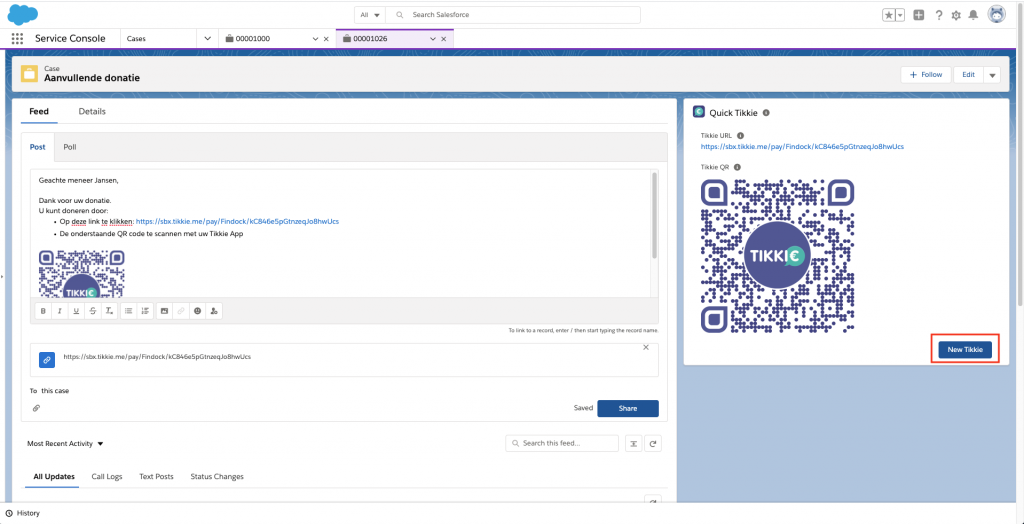 - Quick Tikkie: instantly create a Tikkie URL and QR on any place in Salesforce and use them in your communication with customers and donors. For more information on how to use the Quick Tikkie component, please see the ‘Tikkie payment requests with Quick Tikkie’ section below.