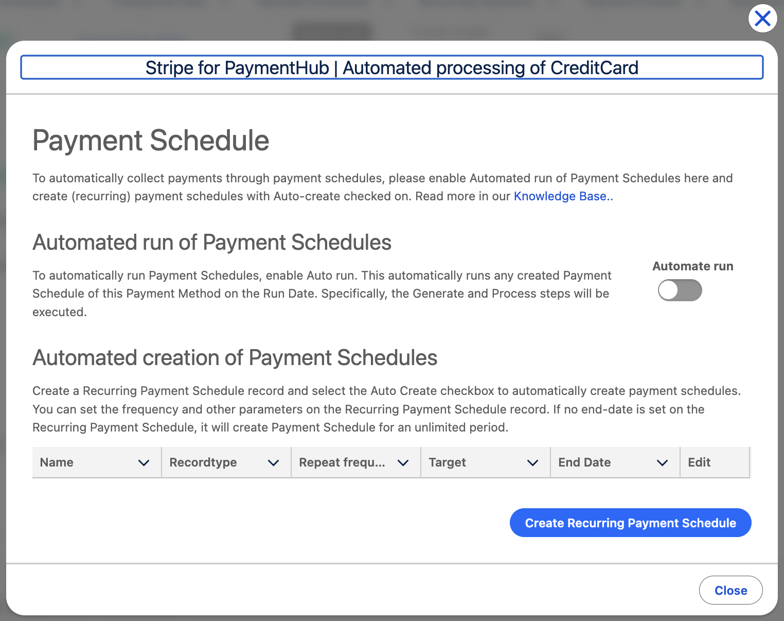 Payment schedules are used to perform bulk payment collections using direct debit, credit card, etc. This article explains how to create and run a payment schedule. For information on how payment schedules work, please see Introduction to payment schedules.