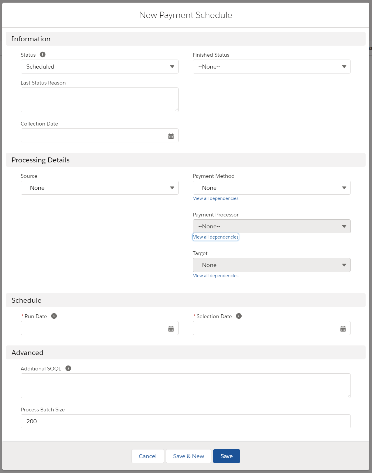 - When you have entered all the details, click Save to store the payment schedule or Save & New to save the schedule and open a new one.