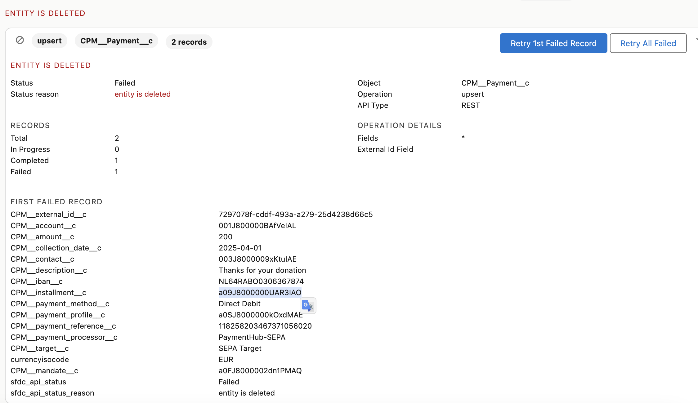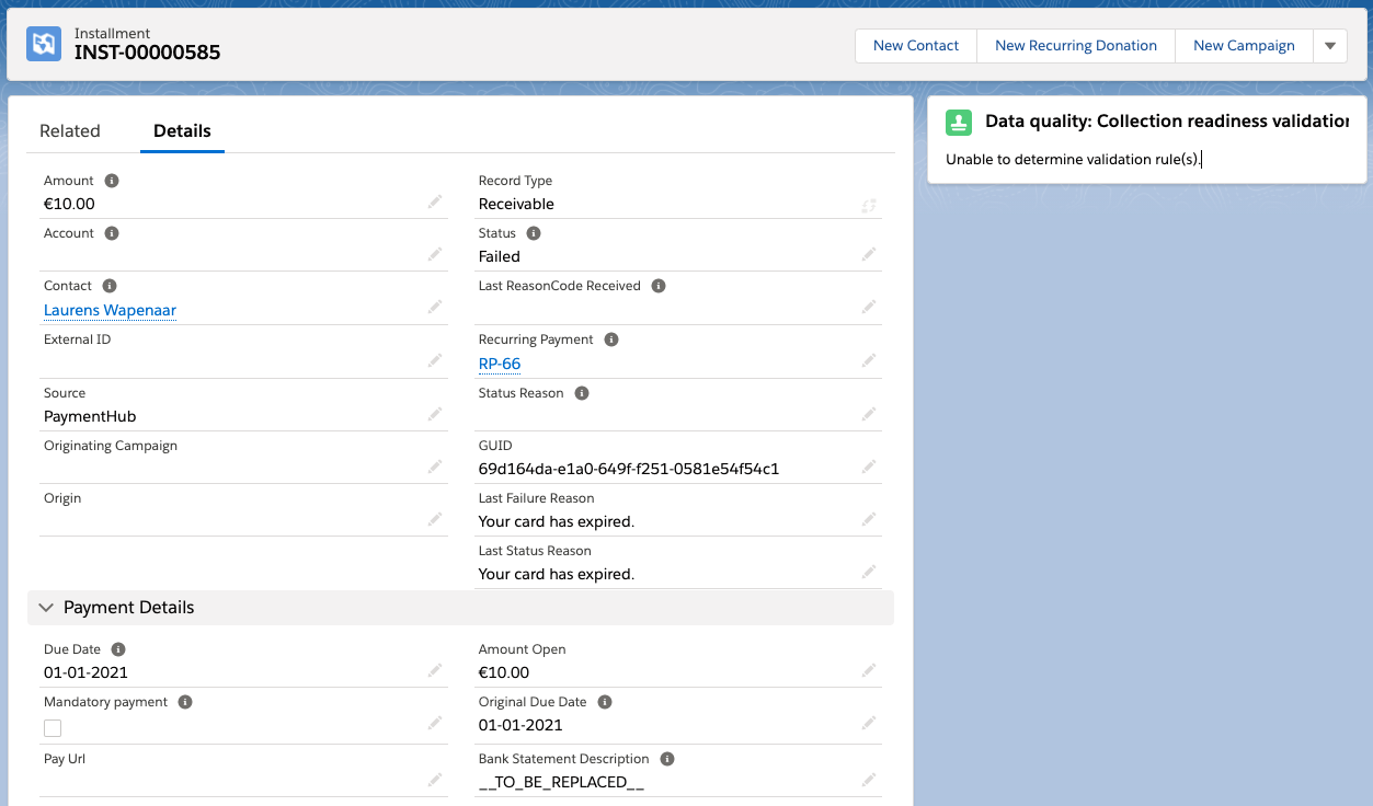 - If it's unclear which records should be restored, use Salesforce Search to look missing records based on the Ids in the failed step details. Start with the installment and contact.