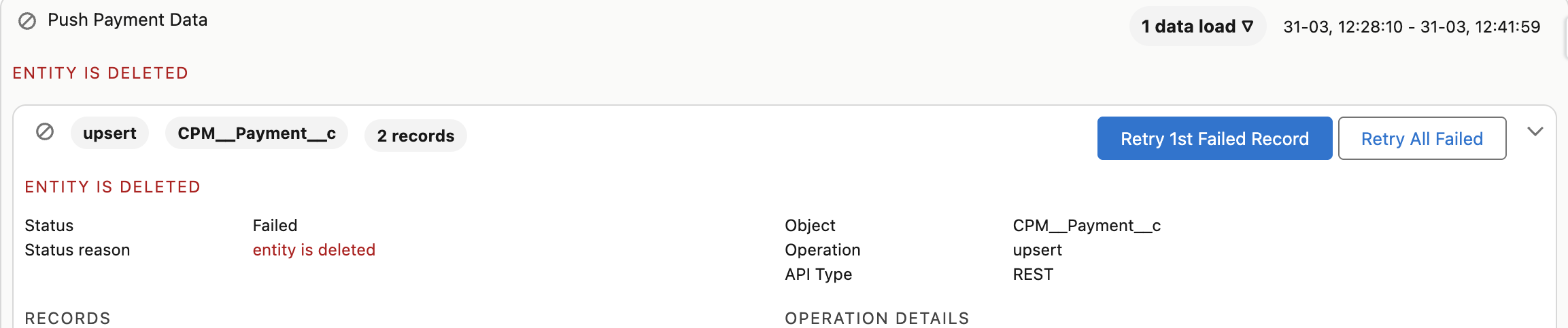 If an installment or related record, such as the account or payment profile, is deleted during the payment schedule run that includes the record, you will encounter an ENTITY_DELETED error. Typically this occurs on the Push Payment Data step where FinDock records in Salesforce. This step cannot be completed if the record is missing, either because it was deleted or it was merged (e.g. merging contacts).