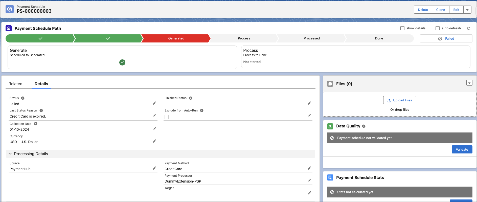 Once you have a valid schedule with valid installments, you can continue with next schedule phase. This is initiated by changing the status of the payment schedule from Generated to Process. This status change can be done manually by clicking Start Processing, or automatically by using workflow, process builder, approval processes or any of the other automation tools available in Salesforce.