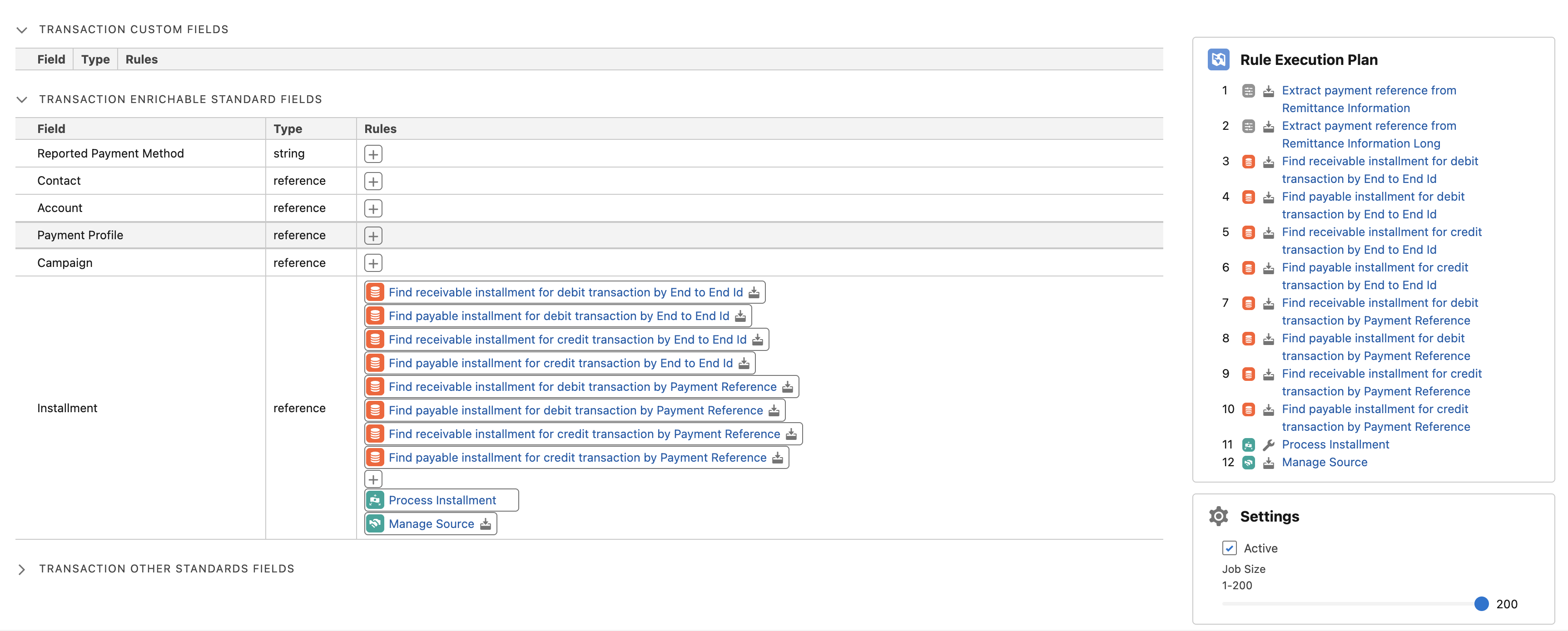 FinDock provides several managed rules out-of-the-box that will automatically process and match transactions coming in through the Bank Feed. These rules set required values for reconciliation as well as finding related installments, updating them (through the Process Installment rule), and finally updating source-specific objects as needed with the final Mange Source rule in the Rule Execution Plan.