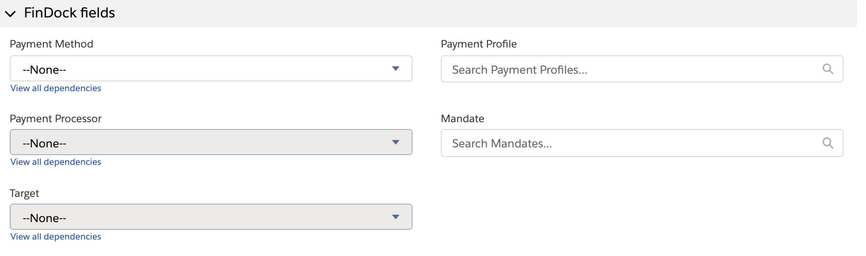 - Creating a new donation/opportunity on the contact for the incoming payment, fill out the fields as you normally would, but leave FinDock fields (Payment Method, Processor, etc.) blank.