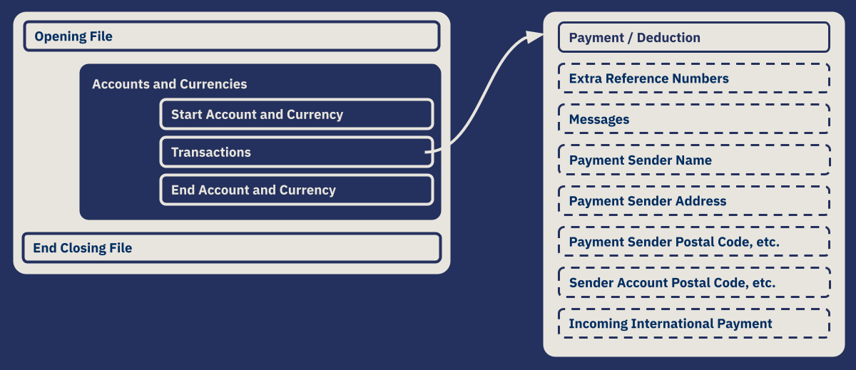 The basic file structure is illustrated below, where a single file can have one or more Accounts and Currencies sections, which in turn have one Transactions section. Each Transactions section has one Payment / Deduction entry and several optional informational entries along with it.