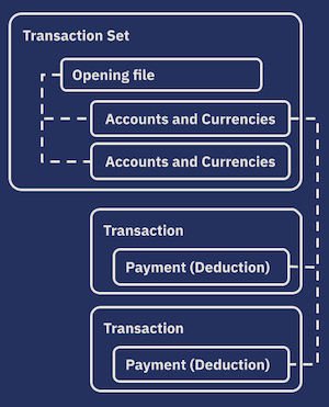 When ProcessingHub parses a Total IN file, a single Transaction Set record is created for the file. Each Accounts and Currencies section in that file is parsed into a Transaction record related to the transaction set.