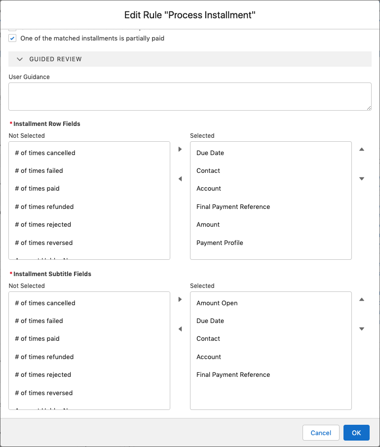 - One of the matched installments is underpaid: If less money was received than expected so that one of the installments is only partially paid, the record is put into Guided Review.