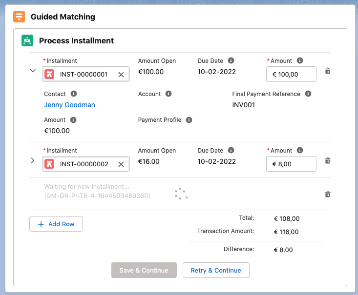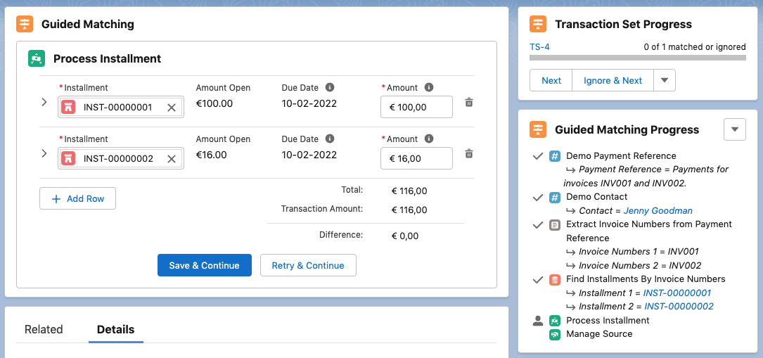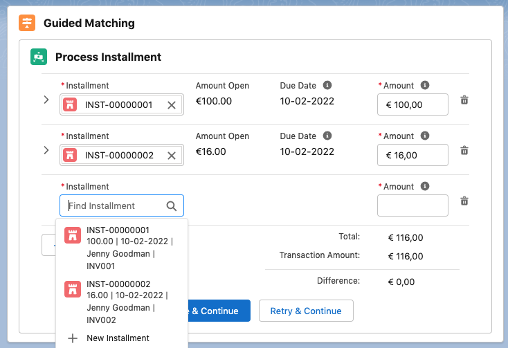 - Leave Remainder on Transaction / Inbound Report: In the case of overpayment, the overpaid amount is added to the Open Amount on the Transaction or Inbound Report. This open amount can be used to partially or fully pay further installments each time Guided Matching is executed on the record. For further information, see the examples below.