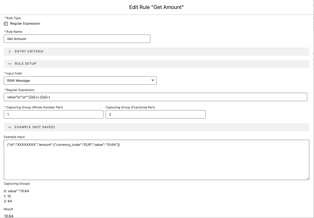 When parsing amounts from inbound records, you may get an Invalid long error when trying to extract an amount value. The error occurs because the regex rule does not properly validate decimals, allowing invalid formats like 10.64.85.