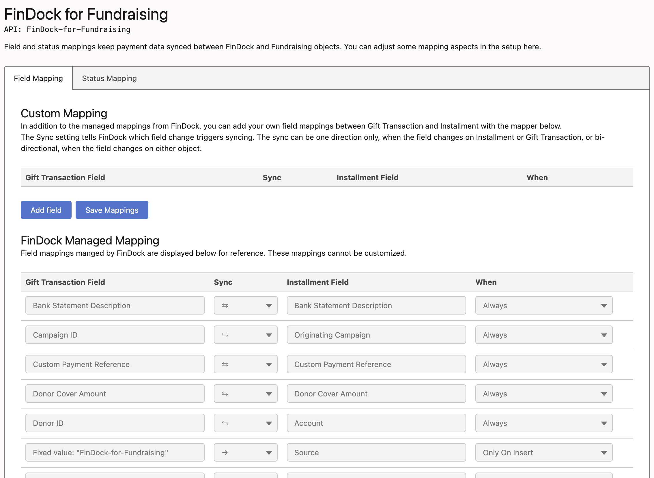 To maintain synchronized data between FinDock and Fundraising objects, FinDock uses managed and custom field mappings.
