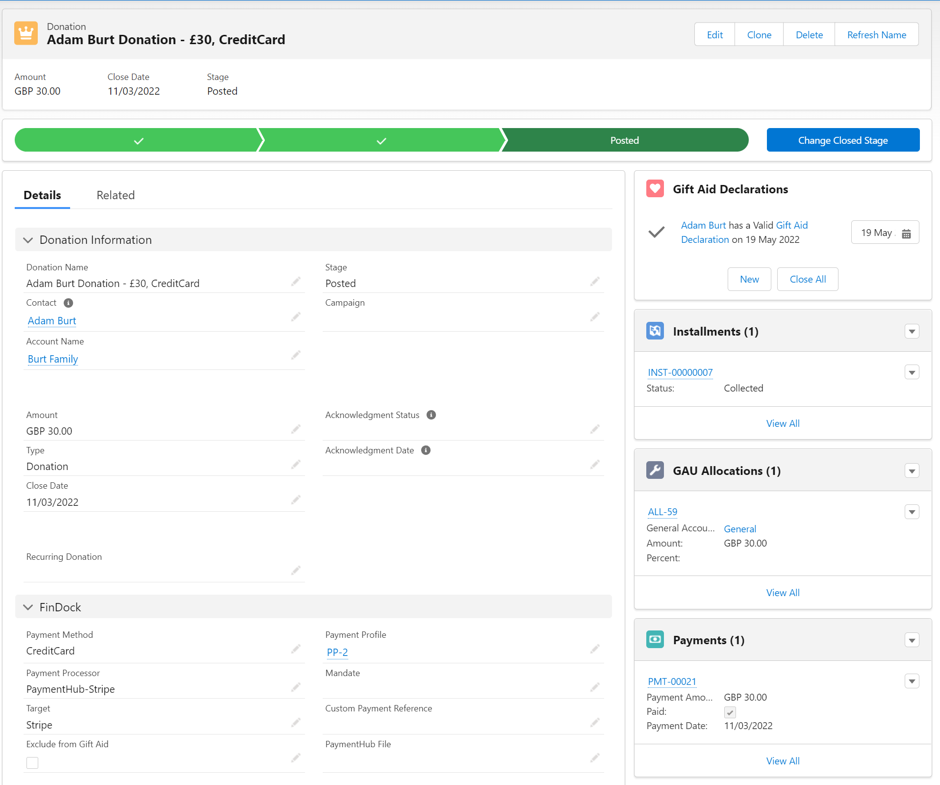 FinDock also uses Posted and Pledged stages. Please make sure they are included in your Opportunity stages configuration. All stages need to be mapped to an installment status.