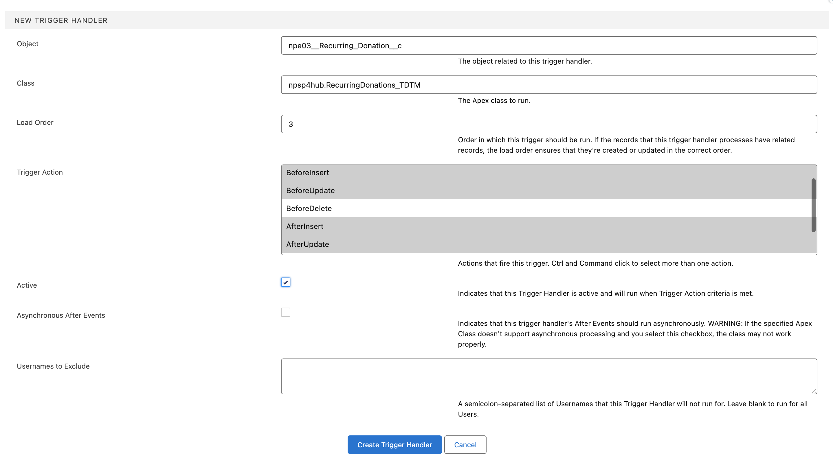- For the Recurring Donation class, the trigger actions are Before Insert, Before Update, After Insert and After Update.