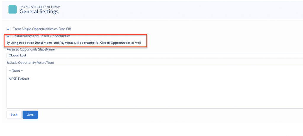 This feature can be enabled or disabled via a setting in your Payment-for-NPSP setup page. To avoid unexpected new behaviour with current implementations, current customers need to opt-in into this setting. On new installs this setting is automatically turned on. It can be turned on or off anytime via the setup page.