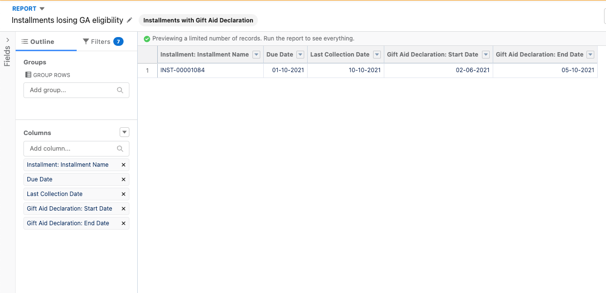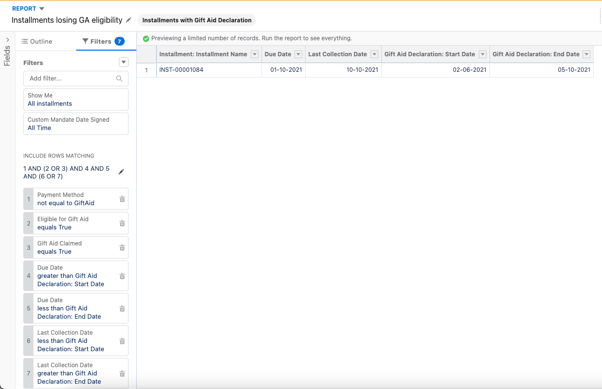 - Run reports with the filters as shown in the following screenshots to check for installments that lose eligibility (and for which Gift Aid has been claimed or would be claimed).