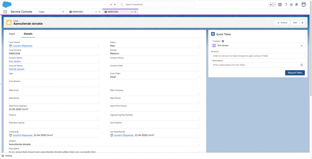 The Tikkie URL and QR can be shared in communication channels both inside and outside Salesforce. Quick Tikkie is implemented as a Salesforce component, so adding Quick Tikkie to any Salesforce object is quick and easy through Salesforce page layout settings.