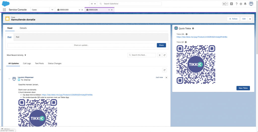 - Use the Quick Tikkie component on any object like Opportunity or Case to quickly generate a Tikkie URL and QR to use in Salesforce communication channels like Salesforce email & Chatter Posts and communication channels outside of Salesforce.