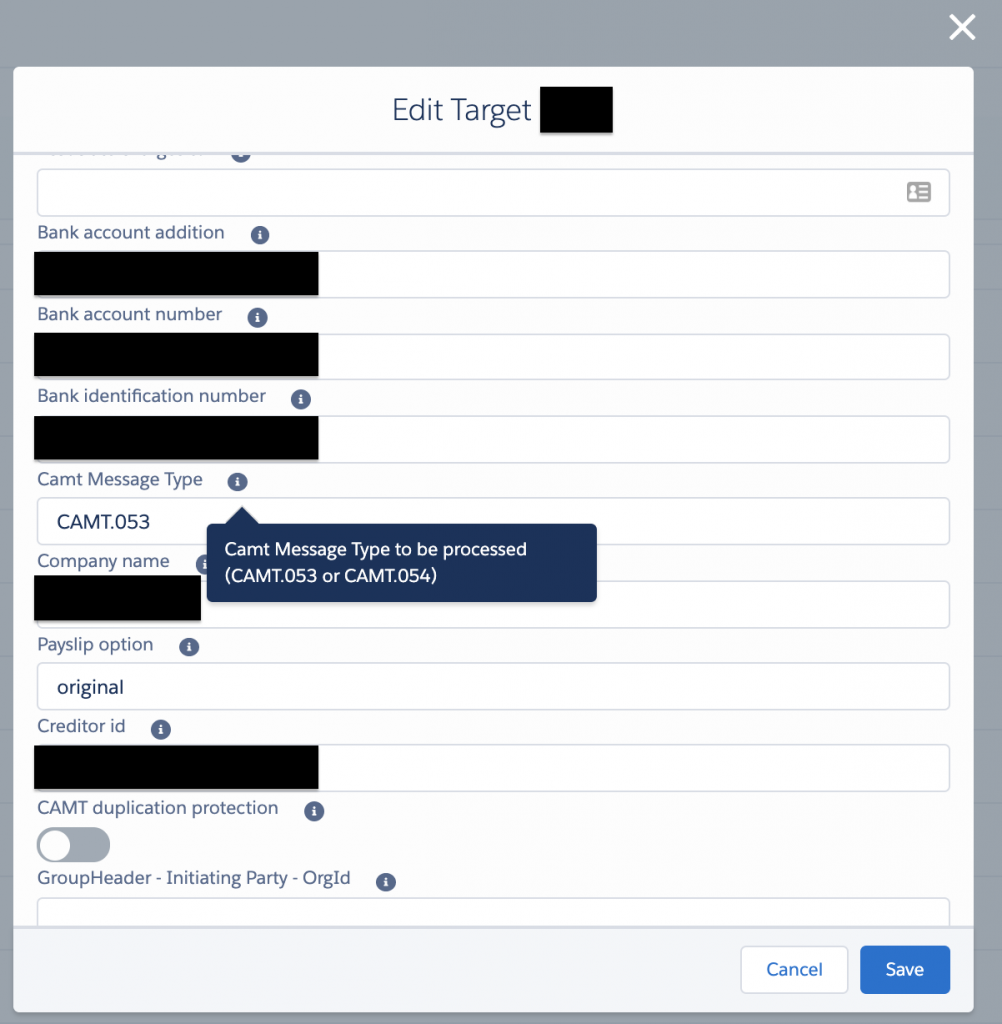 The usage of the camt.054 files can be configured per target in FinDock. By default a target is set to camt.053 processing. That setting can now be changed to camt.054. Currently it is not possible to process both camt.053 and camt.054 reports on the same target (bank account), although the structure of camt.054 is largely the same as camt.053. However, the data created in Salesforce when processing a camt.054 is equal to a camt.053. Processing a camt.054 results in one or multiple transaction sets with the transactions attached to them via a master-detail relationship.