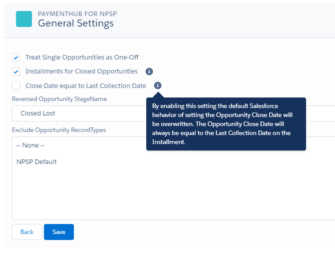 From this release onward, it is possible to override this standard Salesforce behavior and make sure that the Opportunity Close Date is always set to the Installment Last Collection Date, even when that date is in the future. This functionality respects the record types selected in the ‘Exclude Opportunity RecordTypes’ list and does not influence those opportunities.